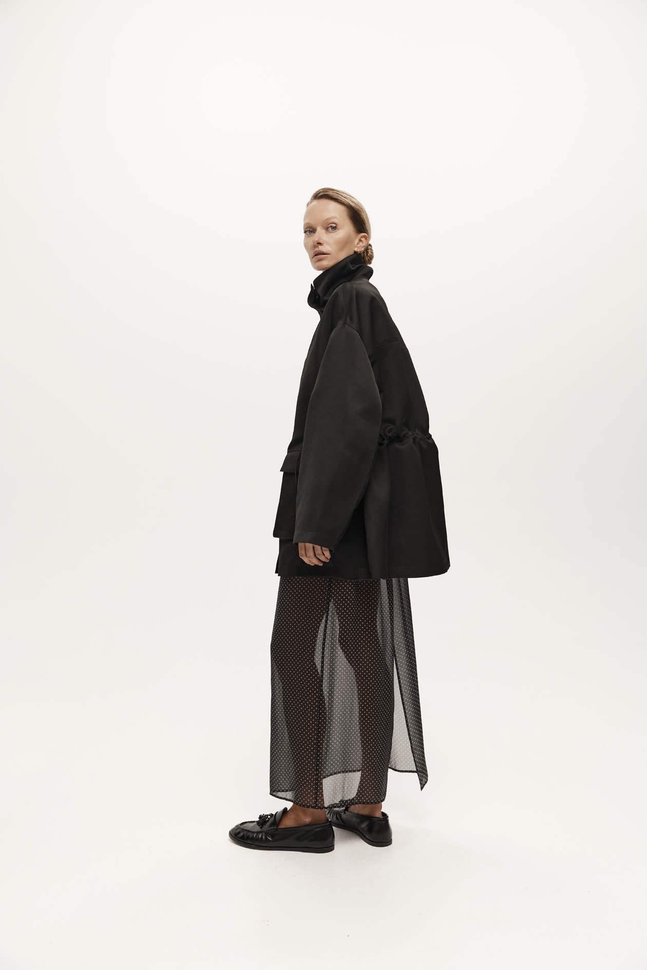 An elevated parka in black satin with a voluminous A-line silhouette. Features a high funnel neck, oversized patch pockets, and adjustable drawcords at the waist. Fully lined. Intentionally designed to be oversized, if wanting closer proportions, then it is recommended to size down.