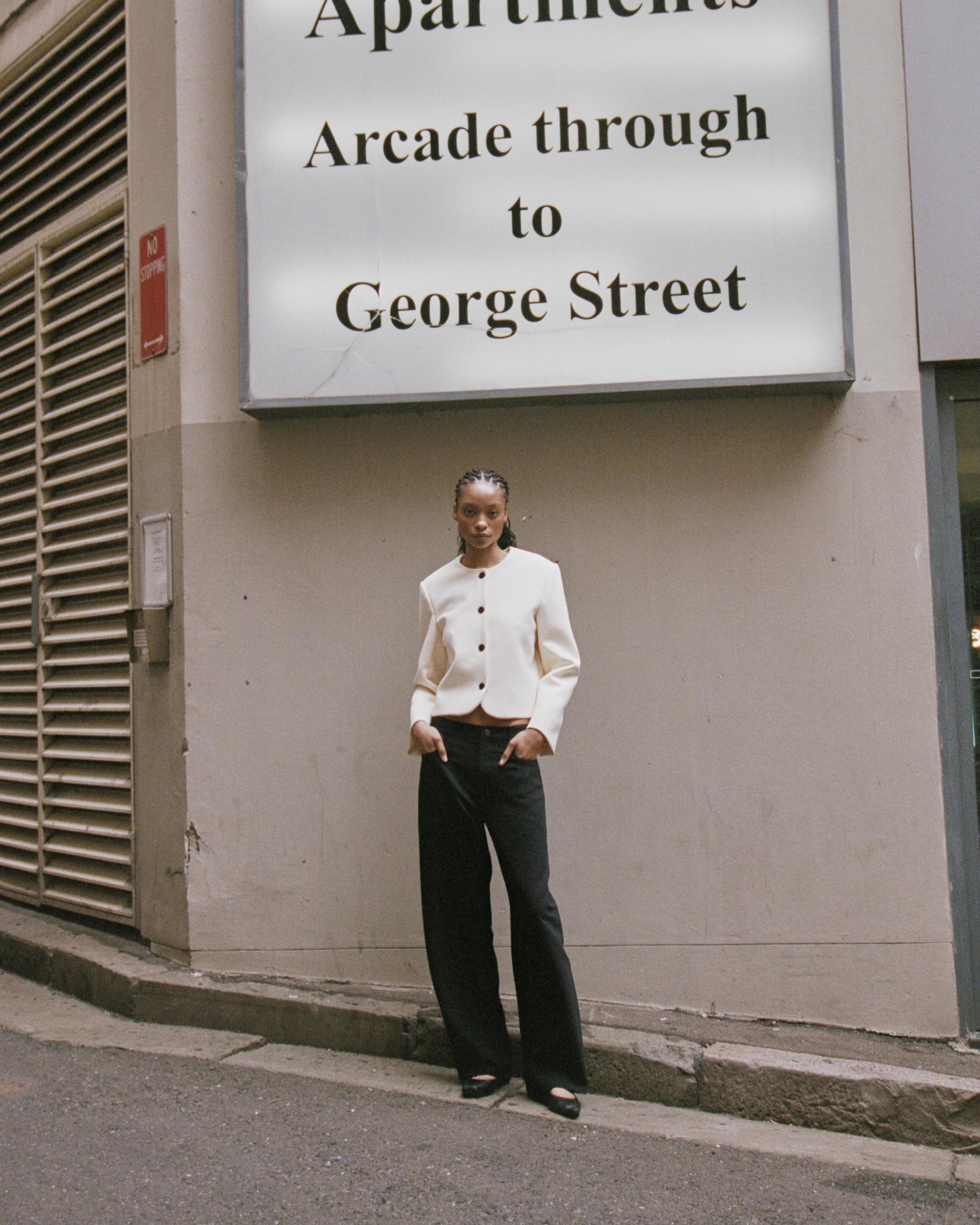 A collarless cropped jacket. Fully lined and designed with '50s and '60s tailoring references in mind. Cut in bonded suiting.