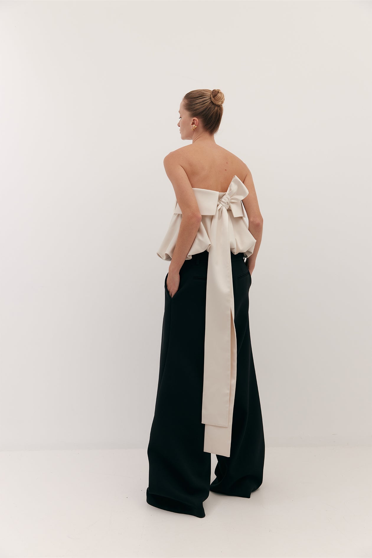 A highly coveted Harris Tapper piece, the Eliza Top subtly references lightweight cloud shaping with a soft bubble hem and long back ties. Cut in a stiff yet soft ivory satin, this is the perfect piece to celebrate any occasion.