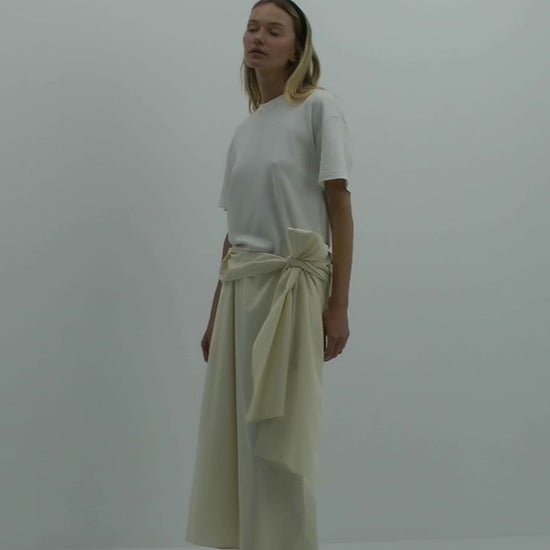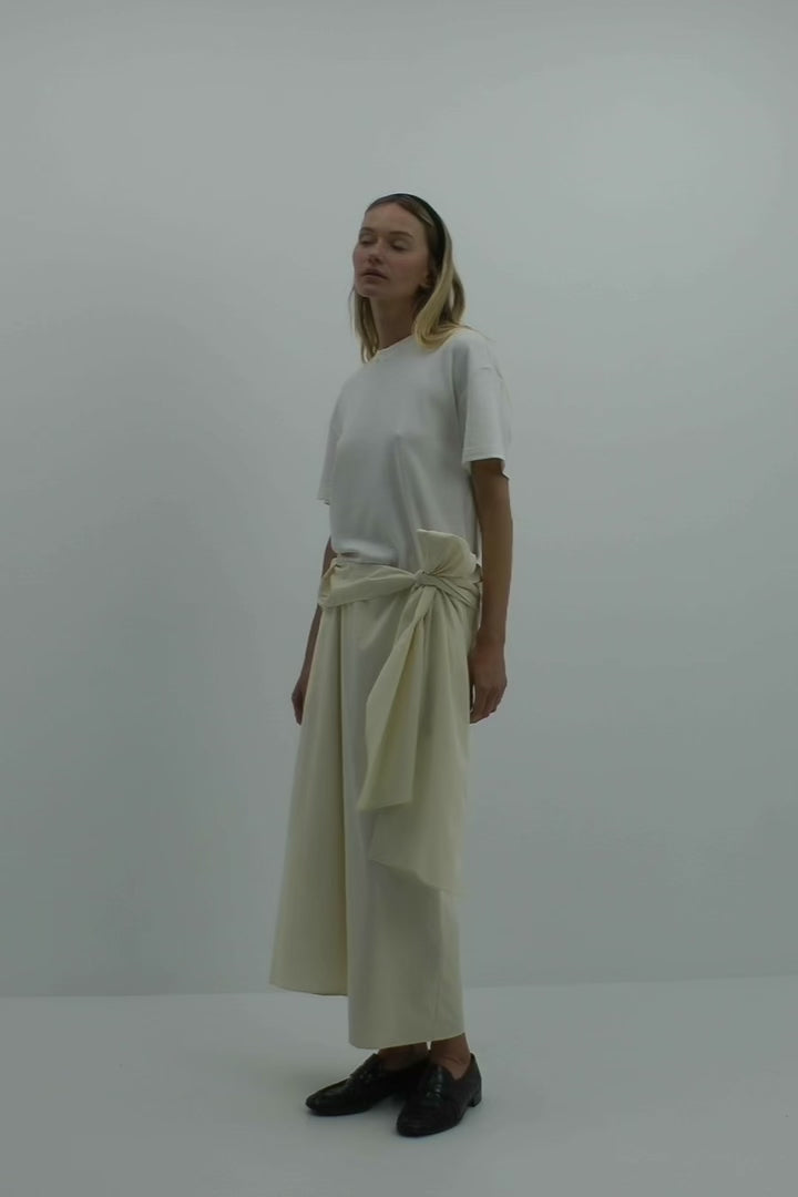 A relaxed style featuring a crew neck and dropped shoulders. Subtle hand beading delicately frames the neckline.