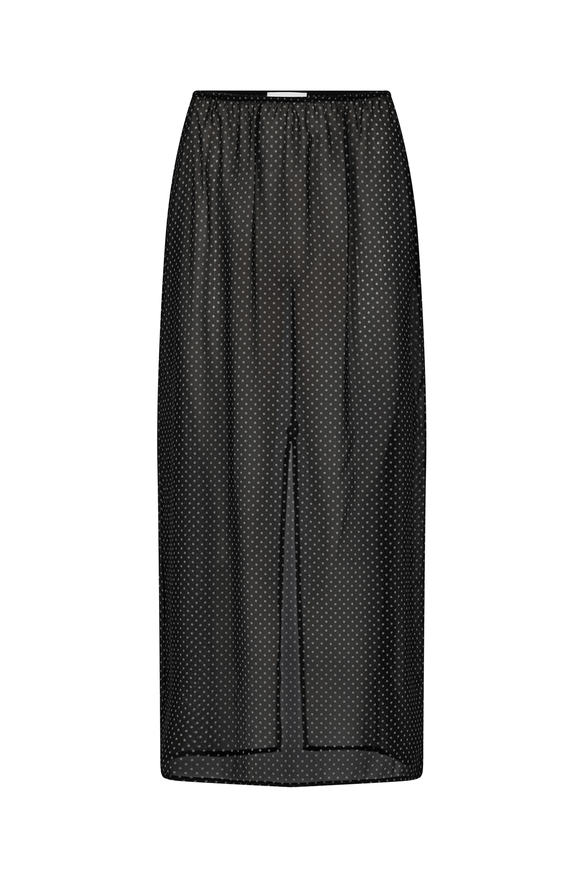 Sheer black silk georgette skirt with a black and white polka dot. Features a delicate elasticated waistband, straight silhouette and back vent for ease of movement. Finishes at the ankle.