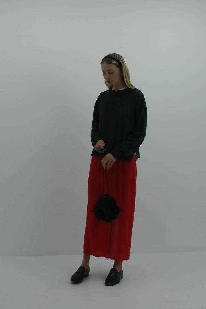 Red silk crepe de chine with a delicate picot elastic waistband, straight silhouette and back vent for ease of movement. Finished at the ankle with a scalloped hem.