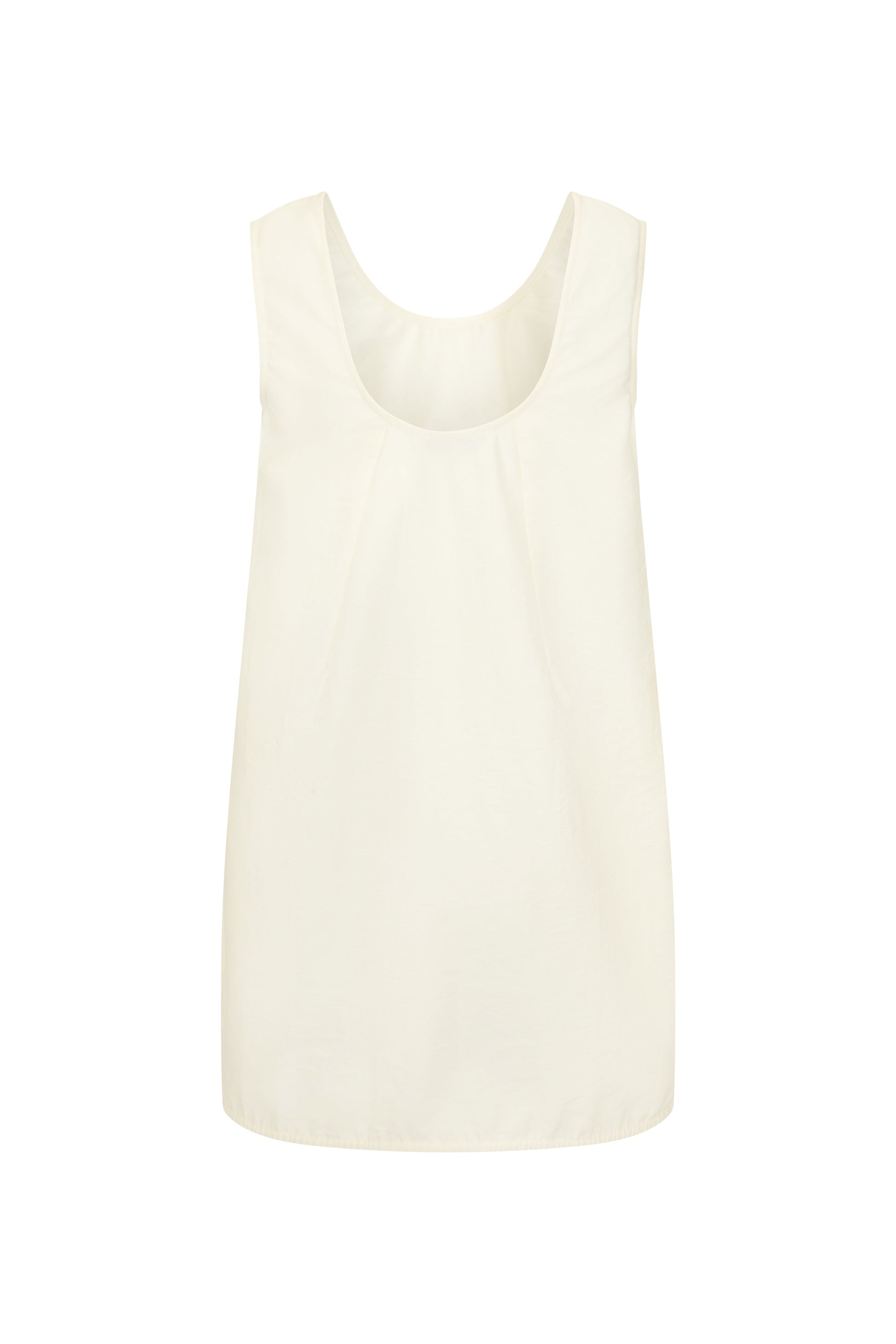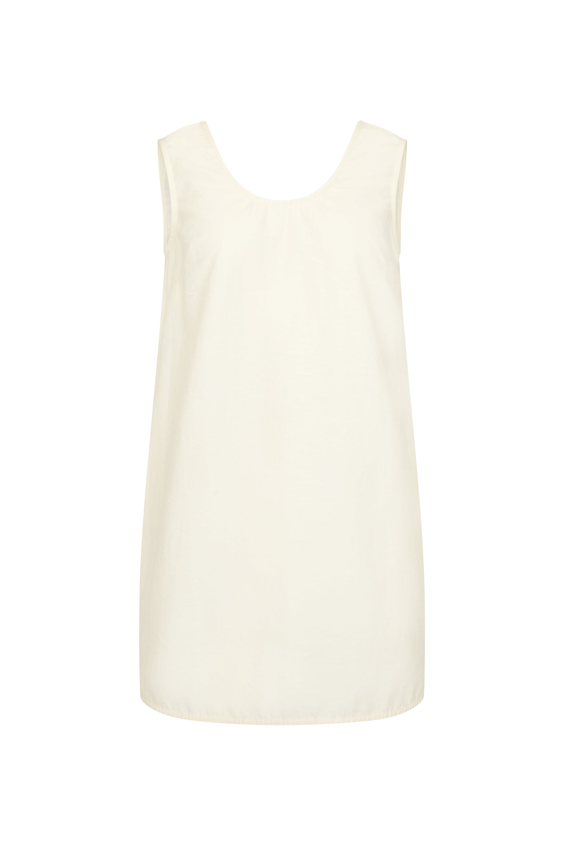 Crafted from cream textured cotton, this sleeveless style features a pared-back silhouette with a subtle cocoon shape that drapes away from the body. Designed for heat and light, it invites the wearer to feel both free and refined. Finished with side pockets for everyday wear. Please note that the hem is 5cm longer than pictured.