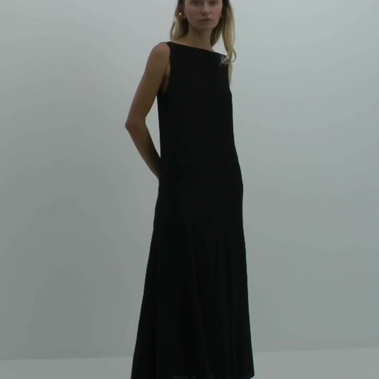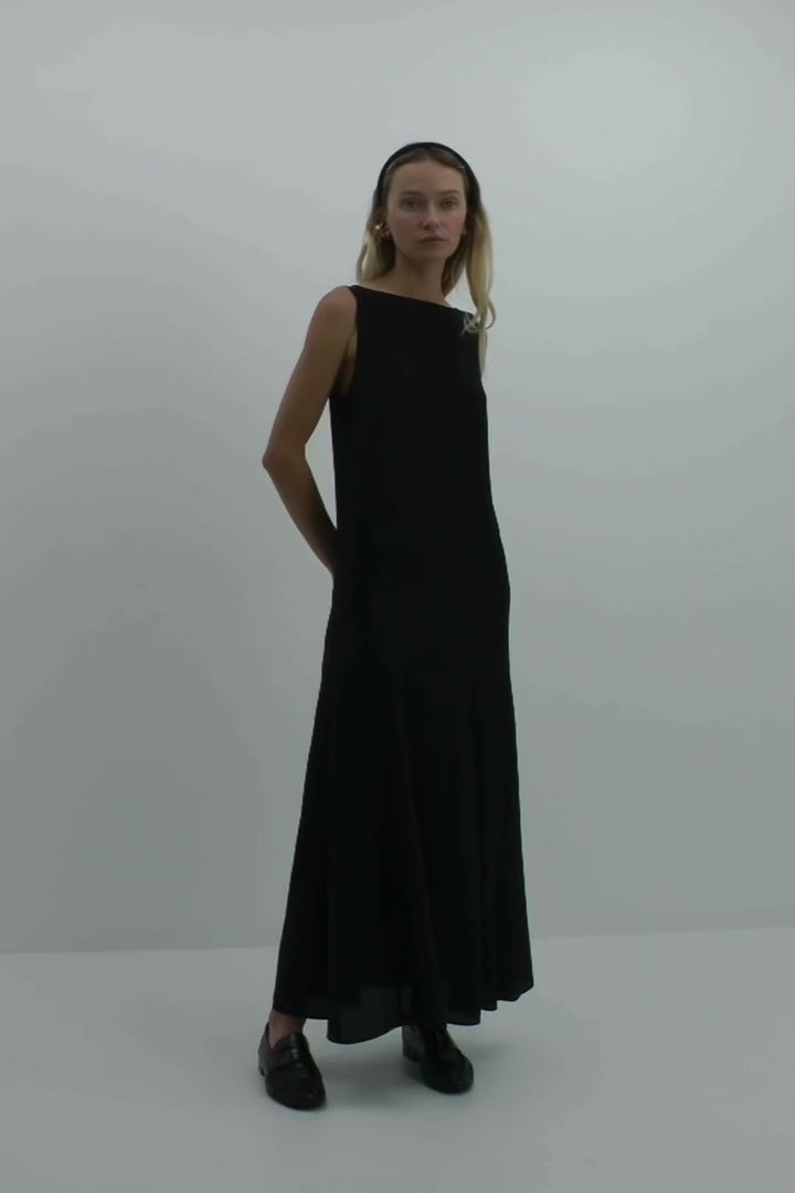 A relaxed '20s inspired silhouette crafted in silk crepe de chine. Designed with a refined boat neckline and a v-cut back finished with delicate button fastenings. The fluid godet skirt adds movement and soft volume with every step.