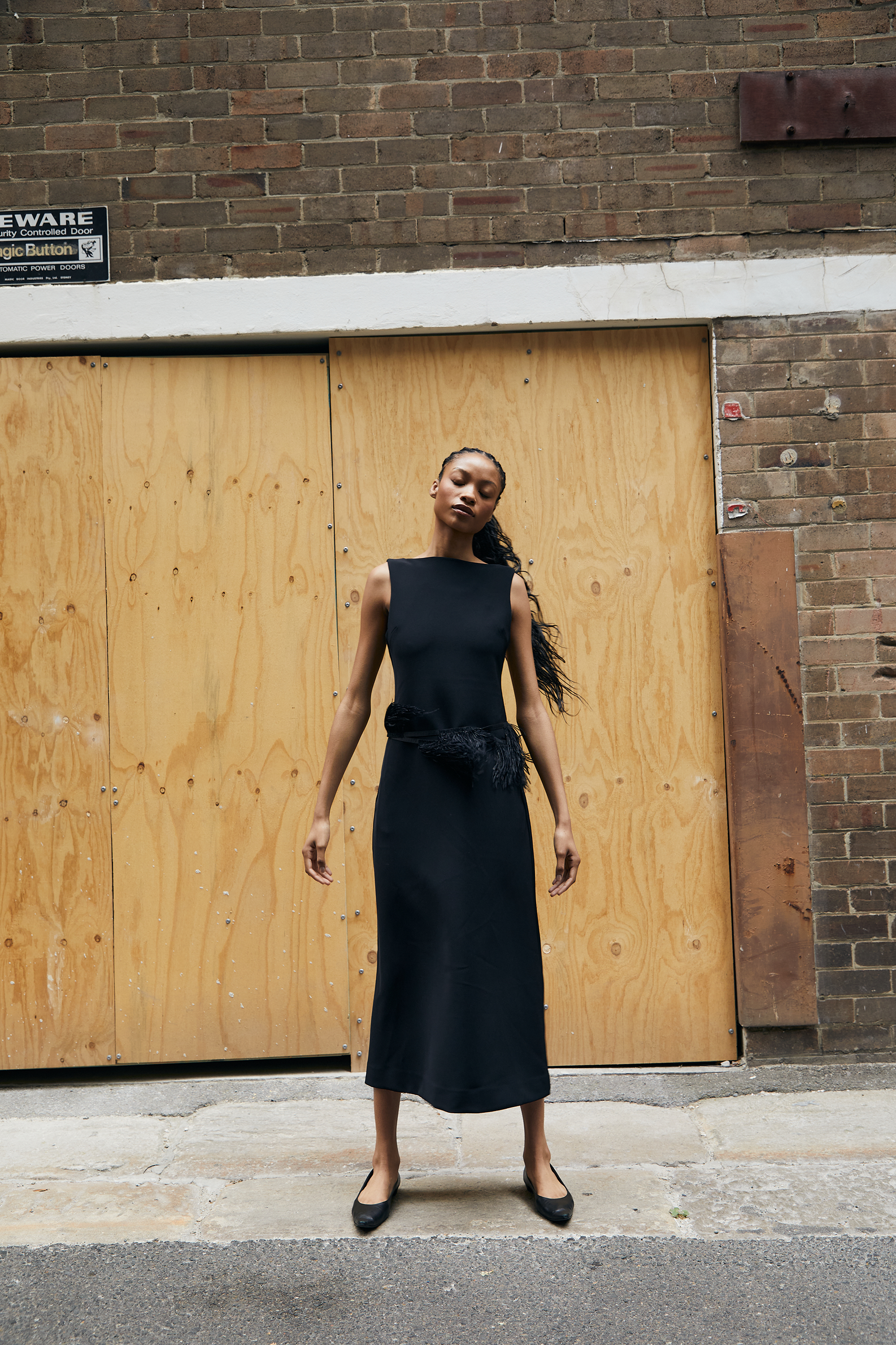 Hiro dress in sculptural black bonded suiting with a sleeveless, A-line silhouette. Features a high round neckline, side seam pockets, and a centre-back zip. Falls to the ankle.