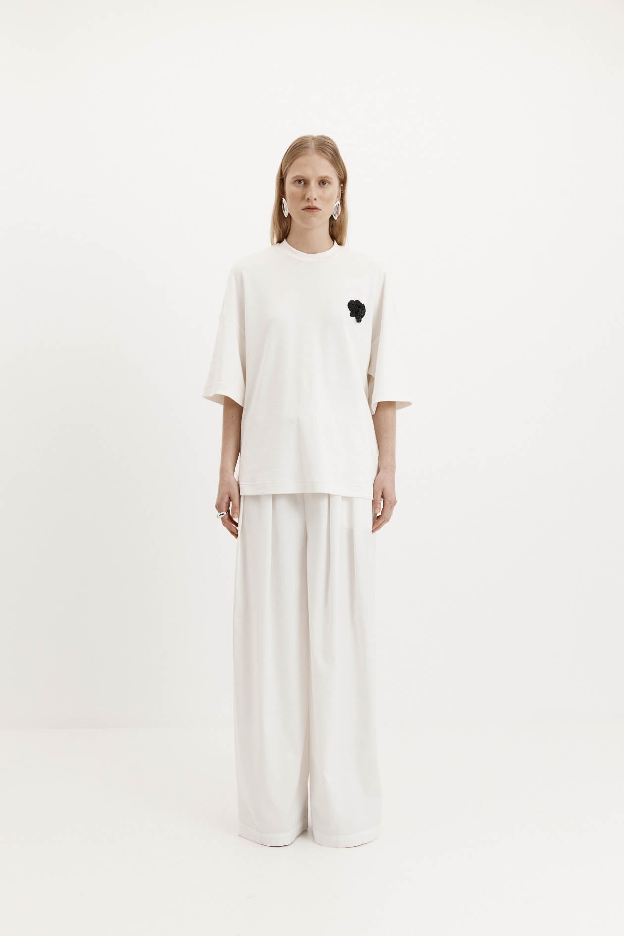 Cut from Cotton T-shirting with dropped shoulders and elbow grazing sleeves for an intentionally oversized fit. Signature black orchid beading embellishes high on the left chest.