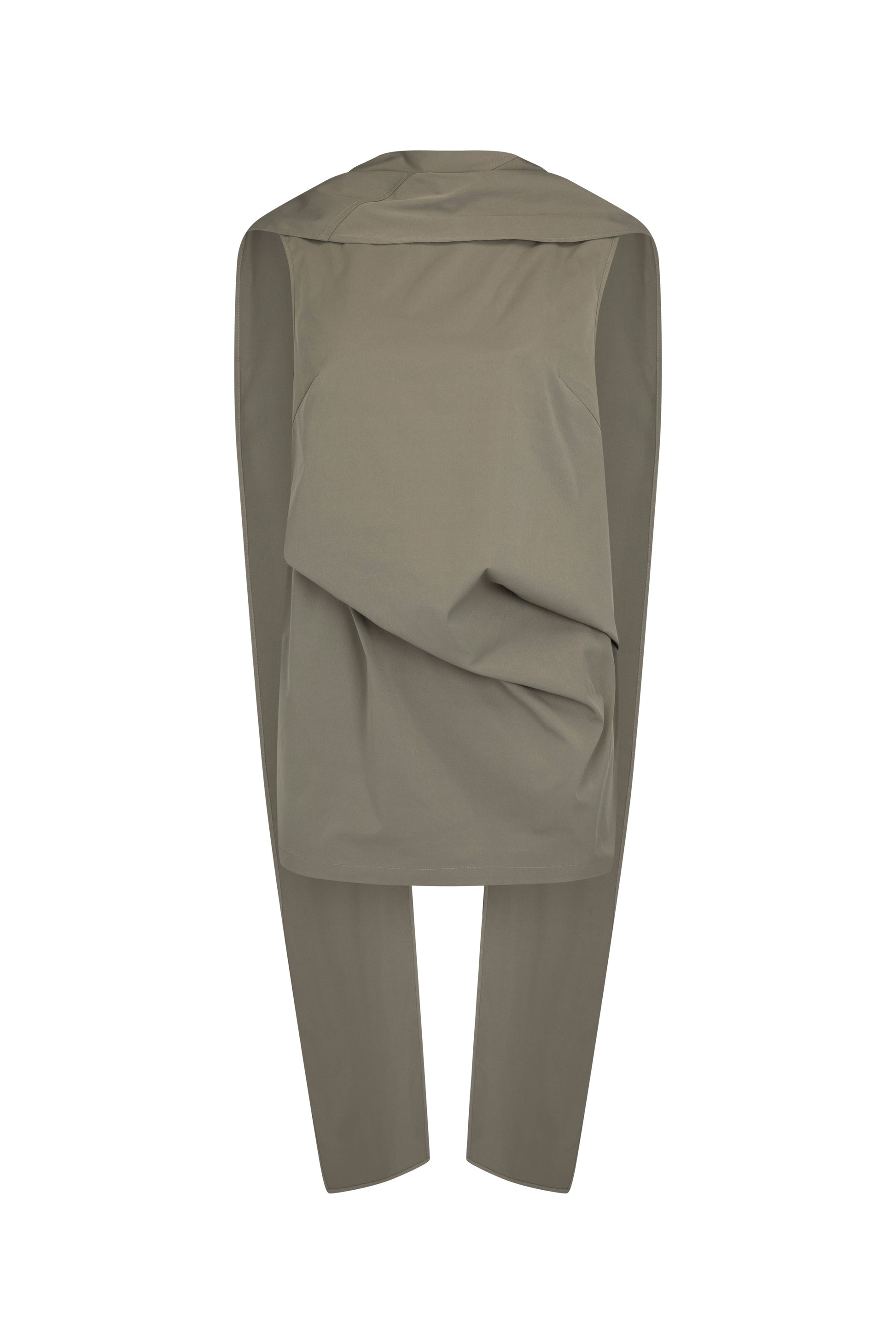 A sculptural silhouette built in tech taffeta with tuck detailing at the waist. Sash panels drape across the shoulders, cascading down the back or tying softly into a half knot.