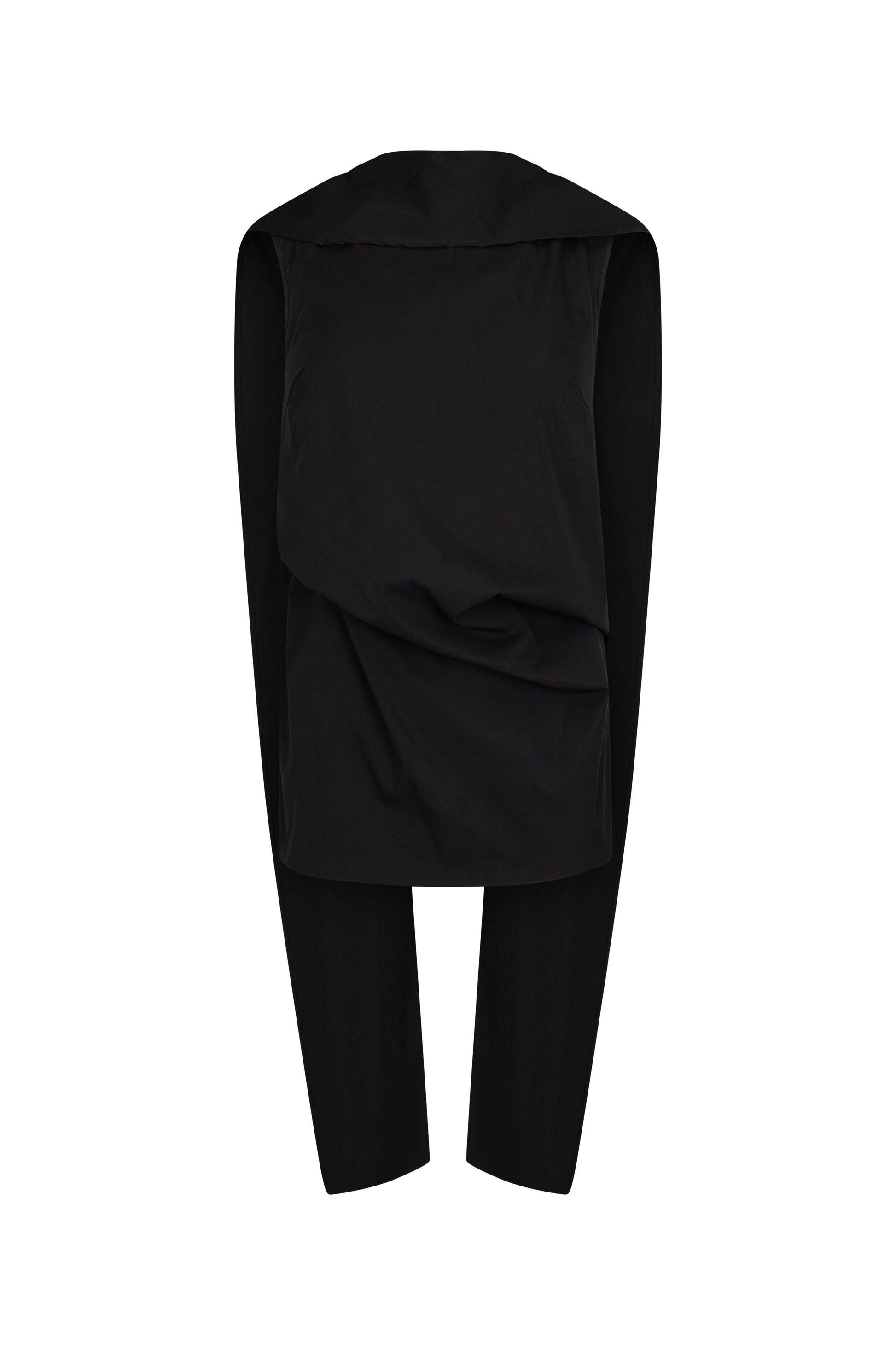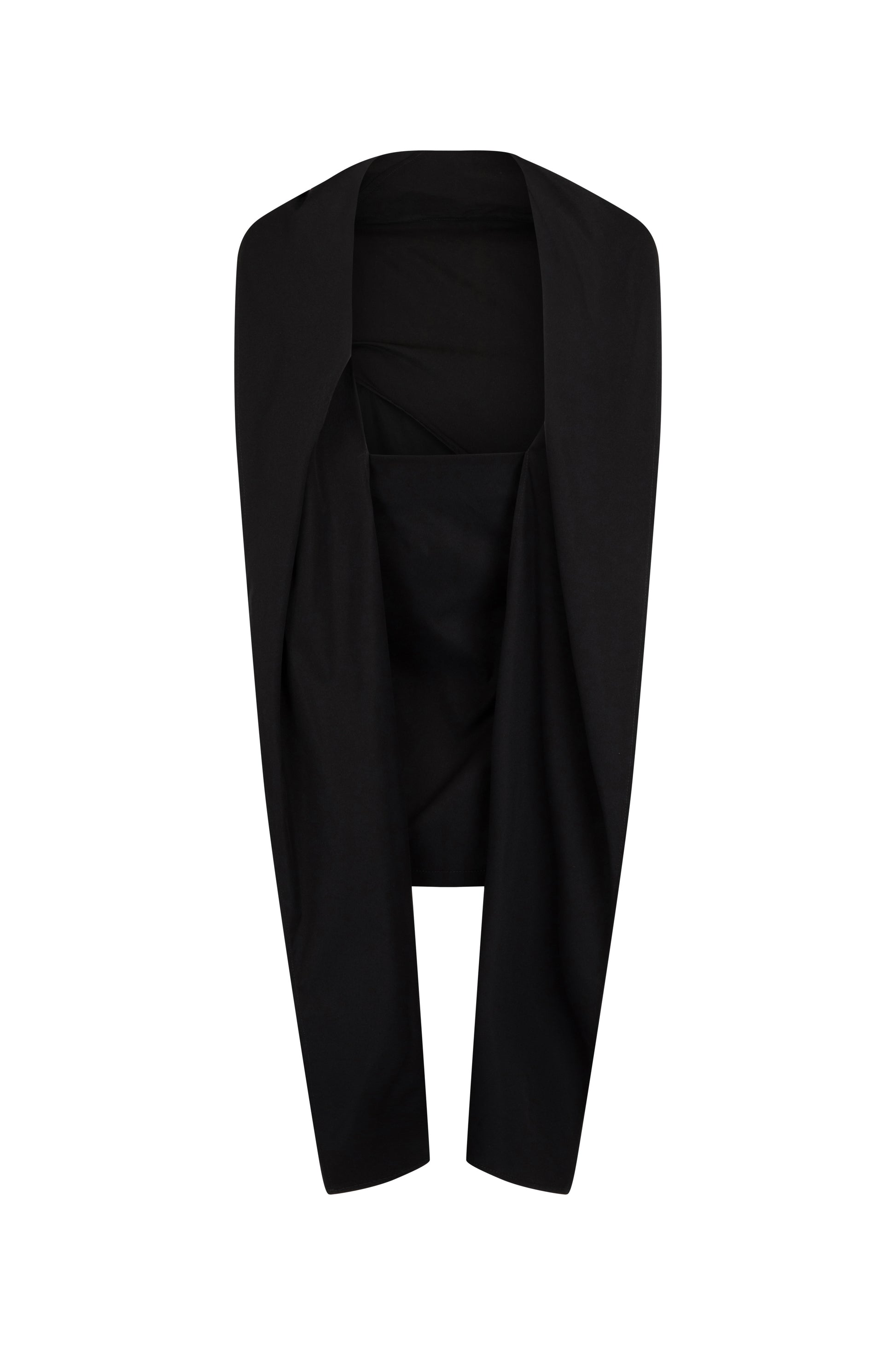 A sculptural silhouette built in tech taffeta with tuck detailing at the waist. Sash panels drape across the shoulders, cascading down the back or tying softly into a half knot.