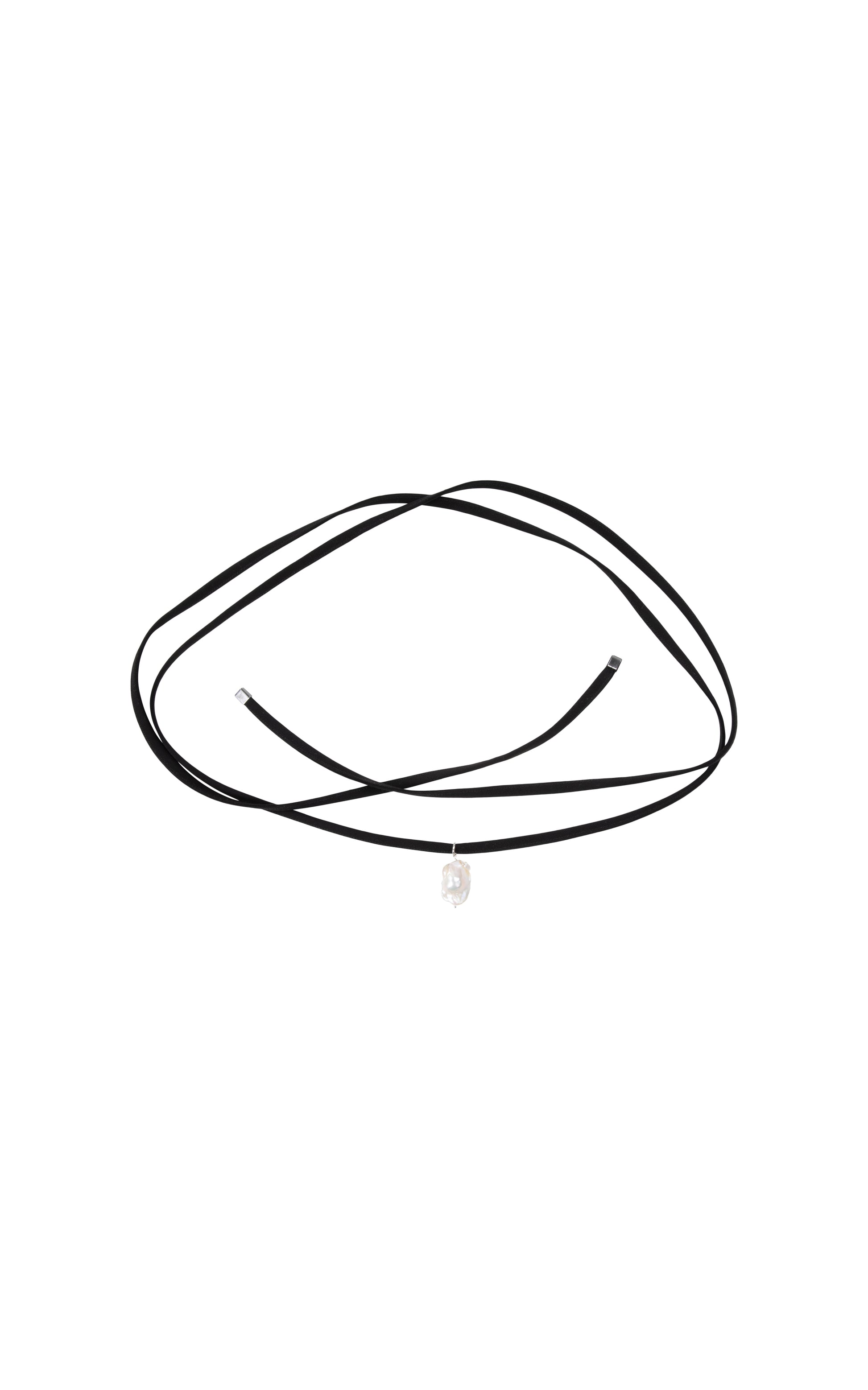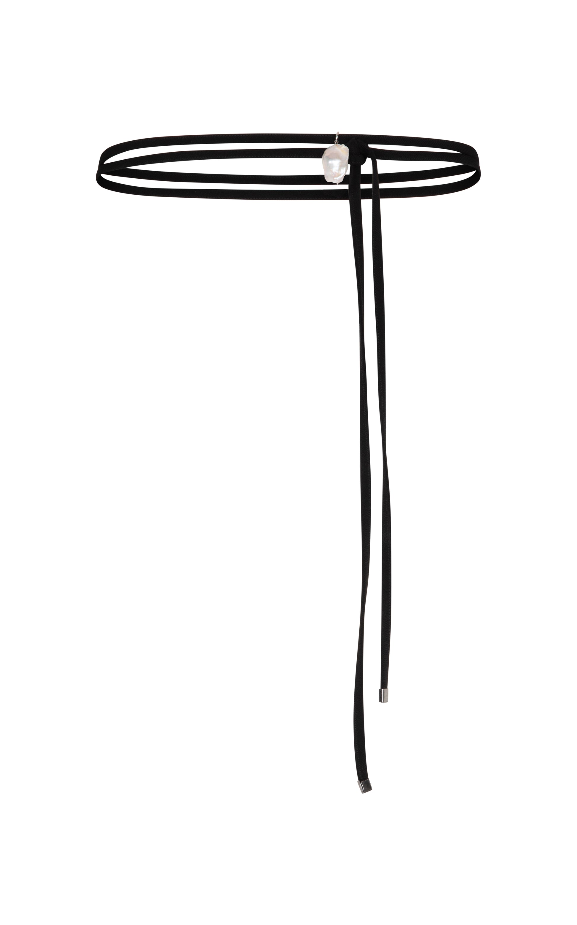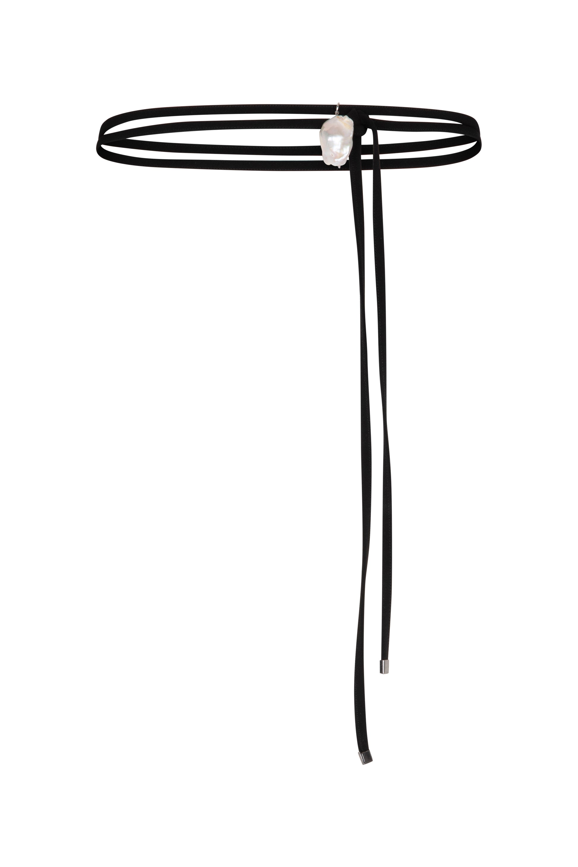 A belt made from bonded suiting featuring a singular large pearl.Use as a neck piece or finish an outfit as a belt. As this belt is made from natural pearl, each piece varies in shape and size.