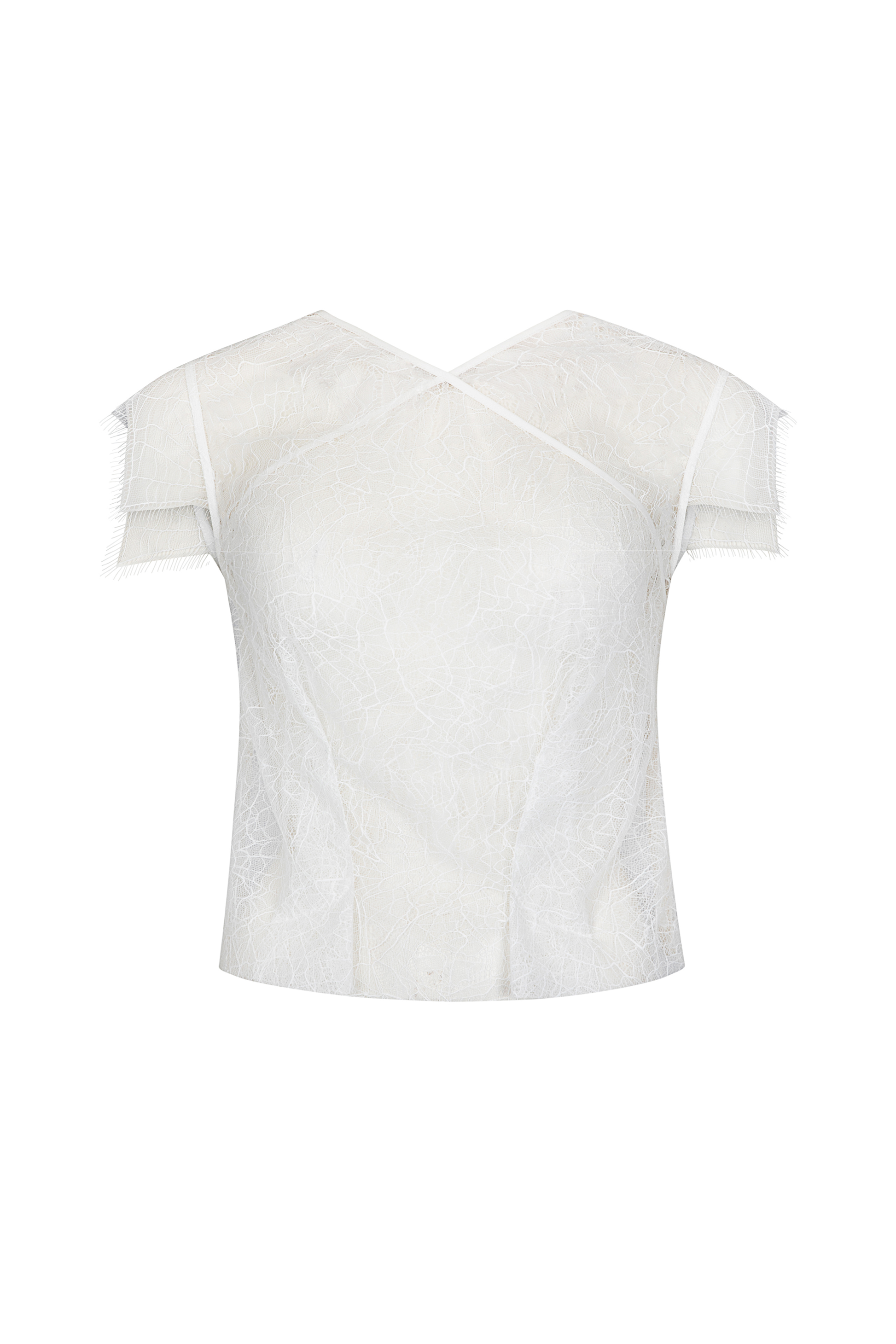 A sheer white lace top with a cropped and fitted silhouette. Two front panels cross high at the neck, while a subtle scalloped cap sleeve frames the shoulder. Features a side zip and visible front and back darts to sculpt the silhouette.