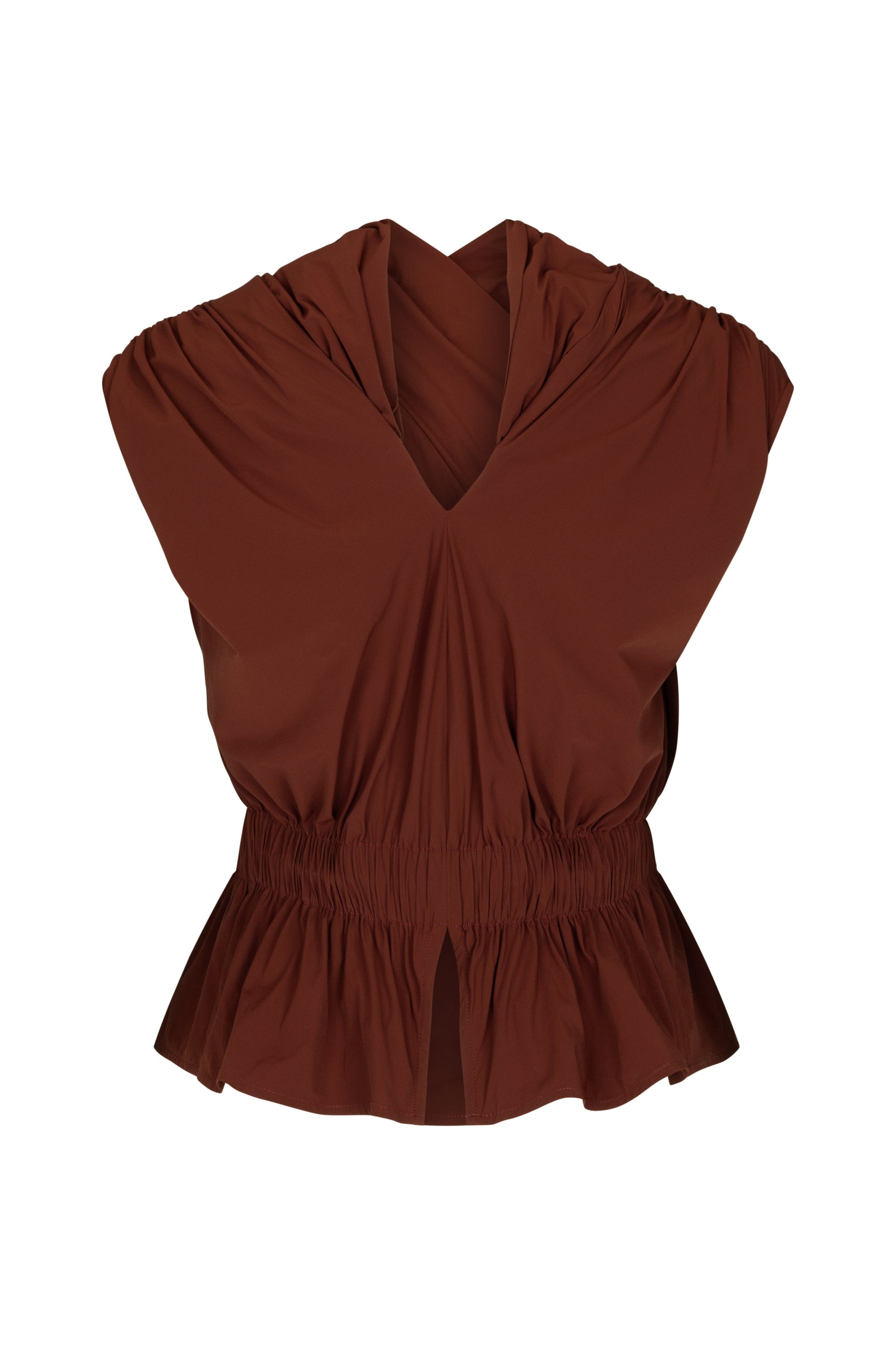 Echoing sculptural forms, a sleeveless wrap top in stretch nylon with gathered shoulders and draping across the front. Elasticated waist adds shape and ease through the silhouette.