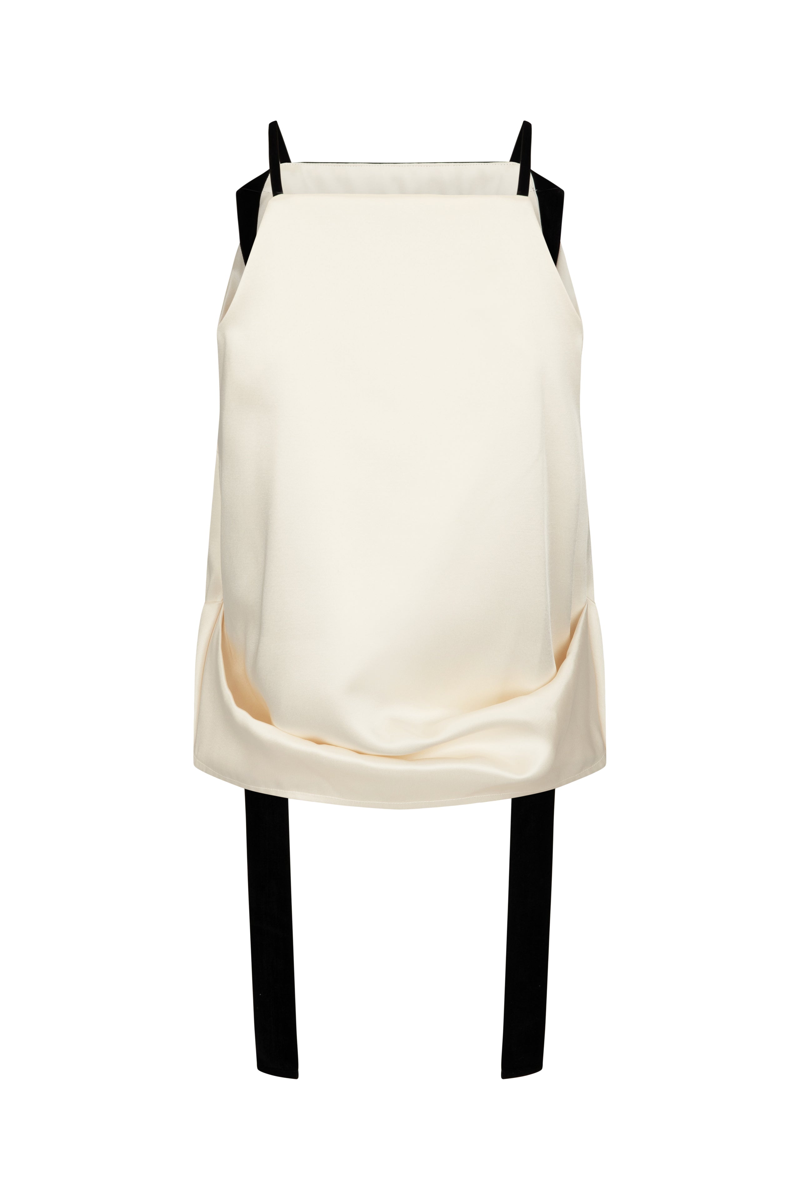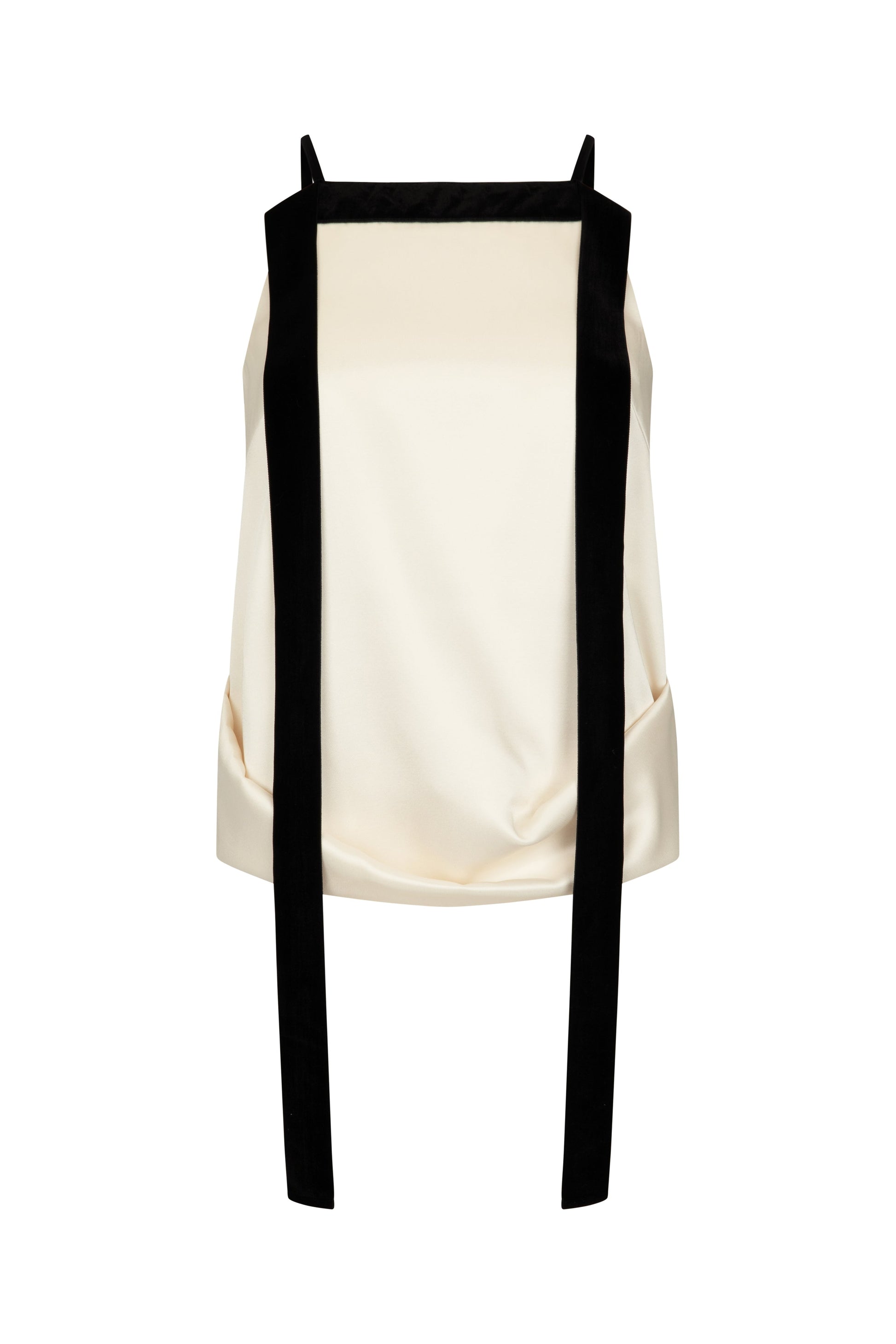 A sculptural silhouette defined by gathered detailing at the waist and a relaxed fit that drapes into a subtle curved hem. Fine straps meet black velvet ribbon overlays which trace the collarbone and frame the bodice, offering contrast to the structured form beneath.