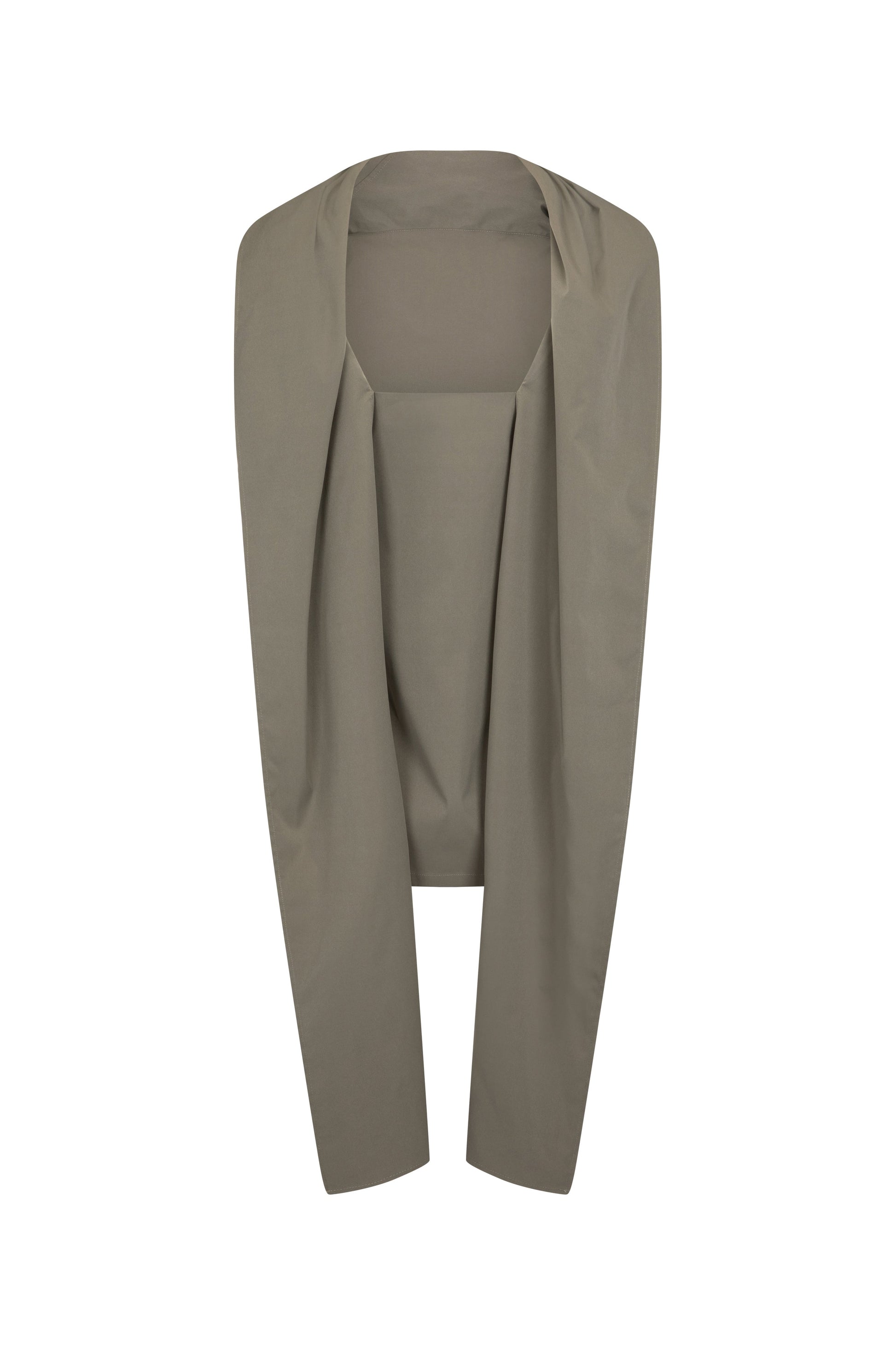 A sculptural silhouette built in tech taffeta with tuck detailing at the waist. Sash panels drape across the shoulders, cascading down the back or tying softly into a half knot.