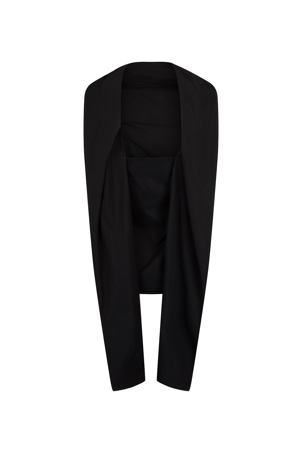 A sculptural silhouette built in tech taffeta with tuck detailing at the waist. Sash panels drape across the shoulders, cascading down the back or tying softly into a half knot.