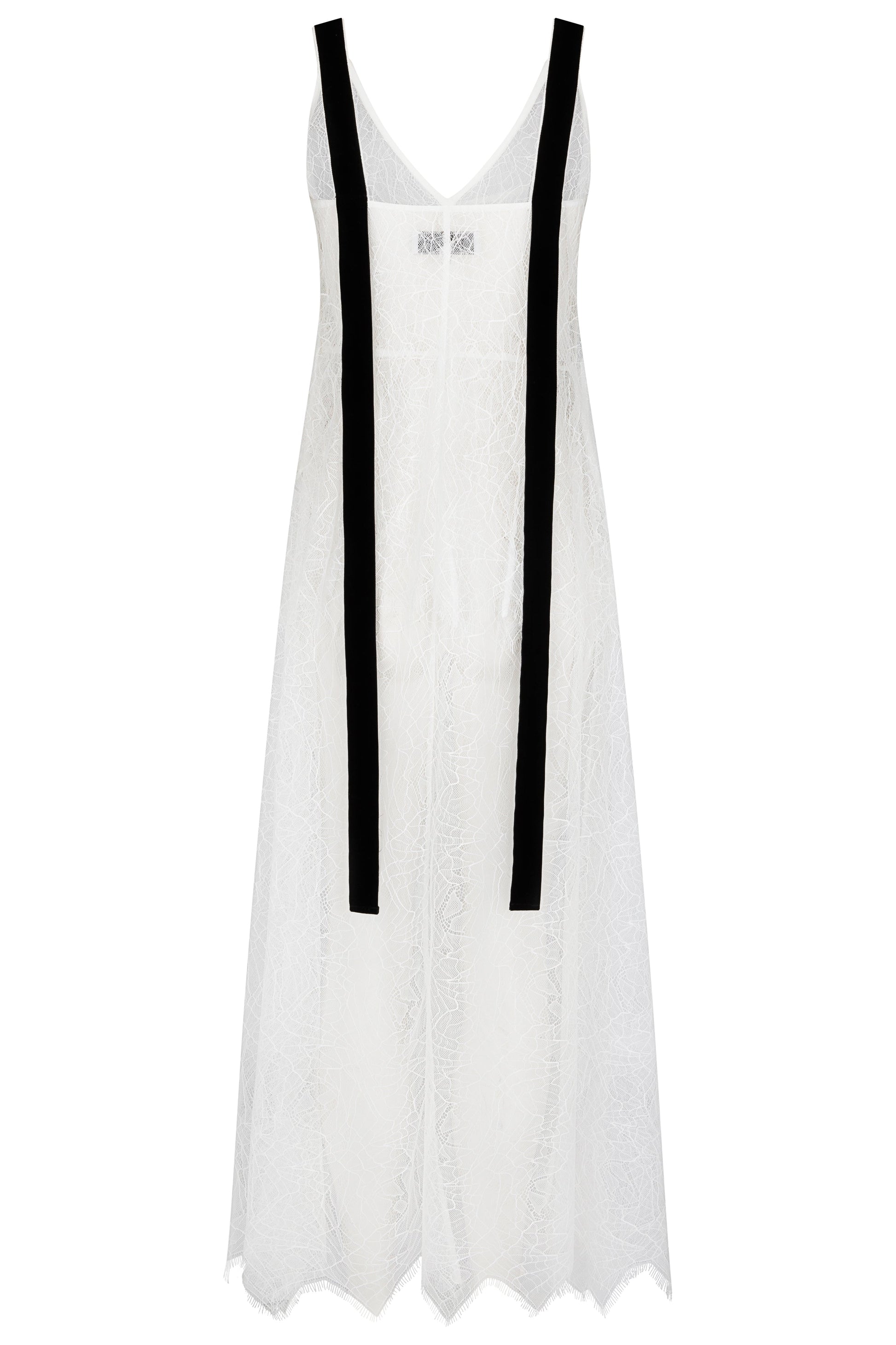 A sleeveless dress cut in sheer white lace with a V-shaped neckline. The bodice features a second layer, which flares high on the waist and falls delicately over the calf length skirt. Black velvet ribbon overlays form the straps, draping fluidly from each shoulder. Features a side zip closure and scalloped hems.