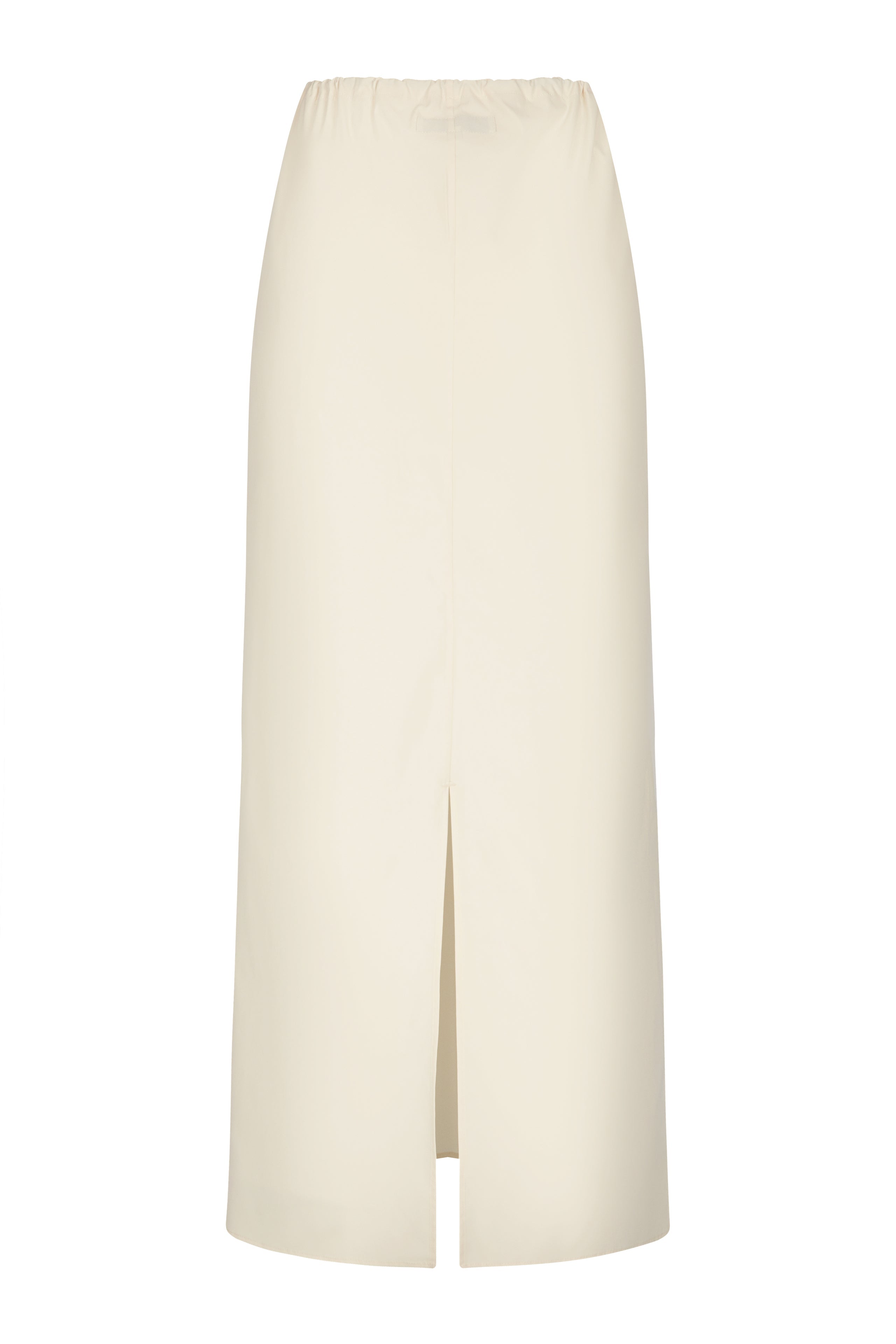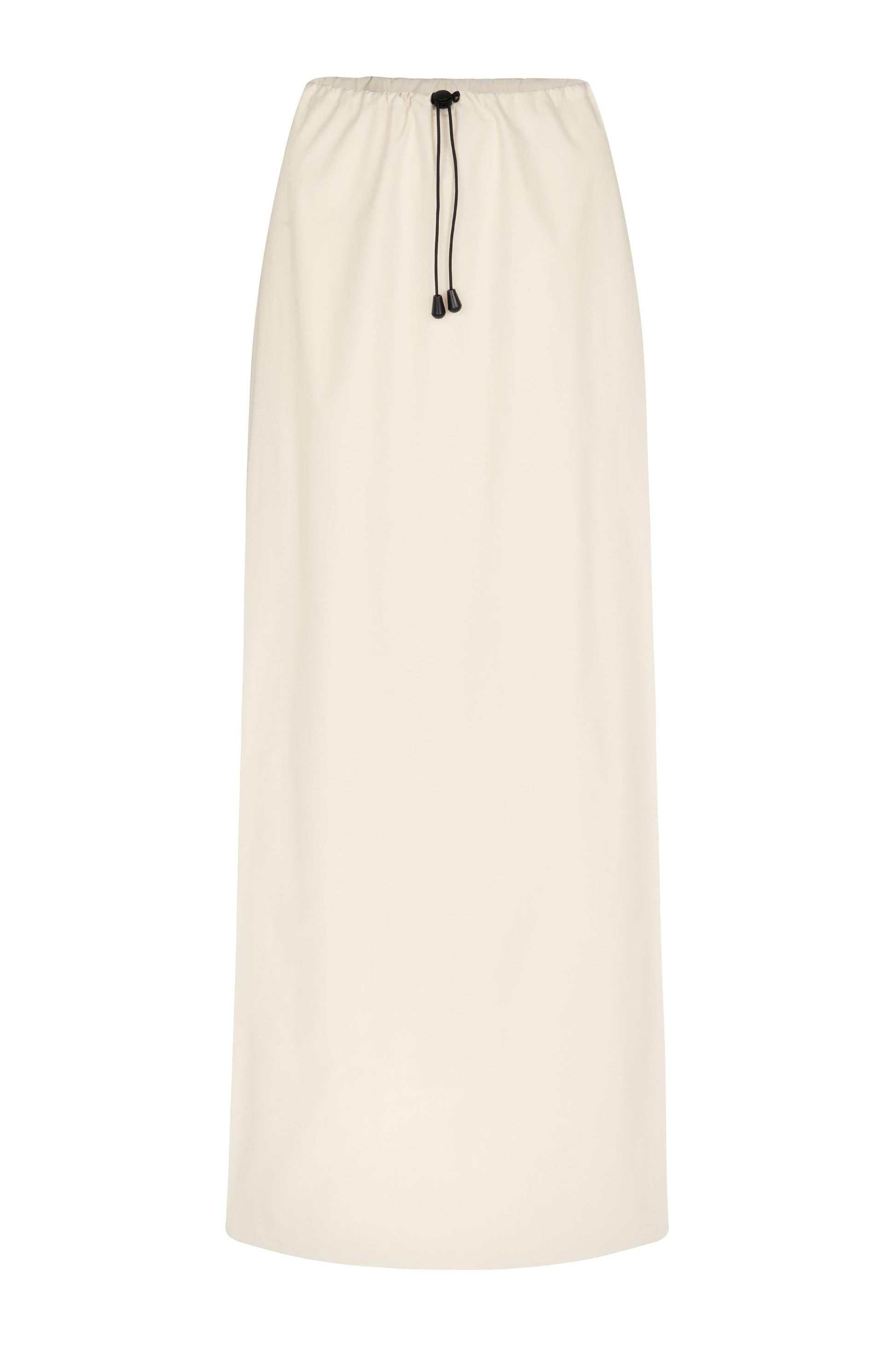 A relaxed ankle length skirt featuring a bungee drawcord waist closure, crafted in vanilla tech taffeta. Features a centre back slit for ease of movement.