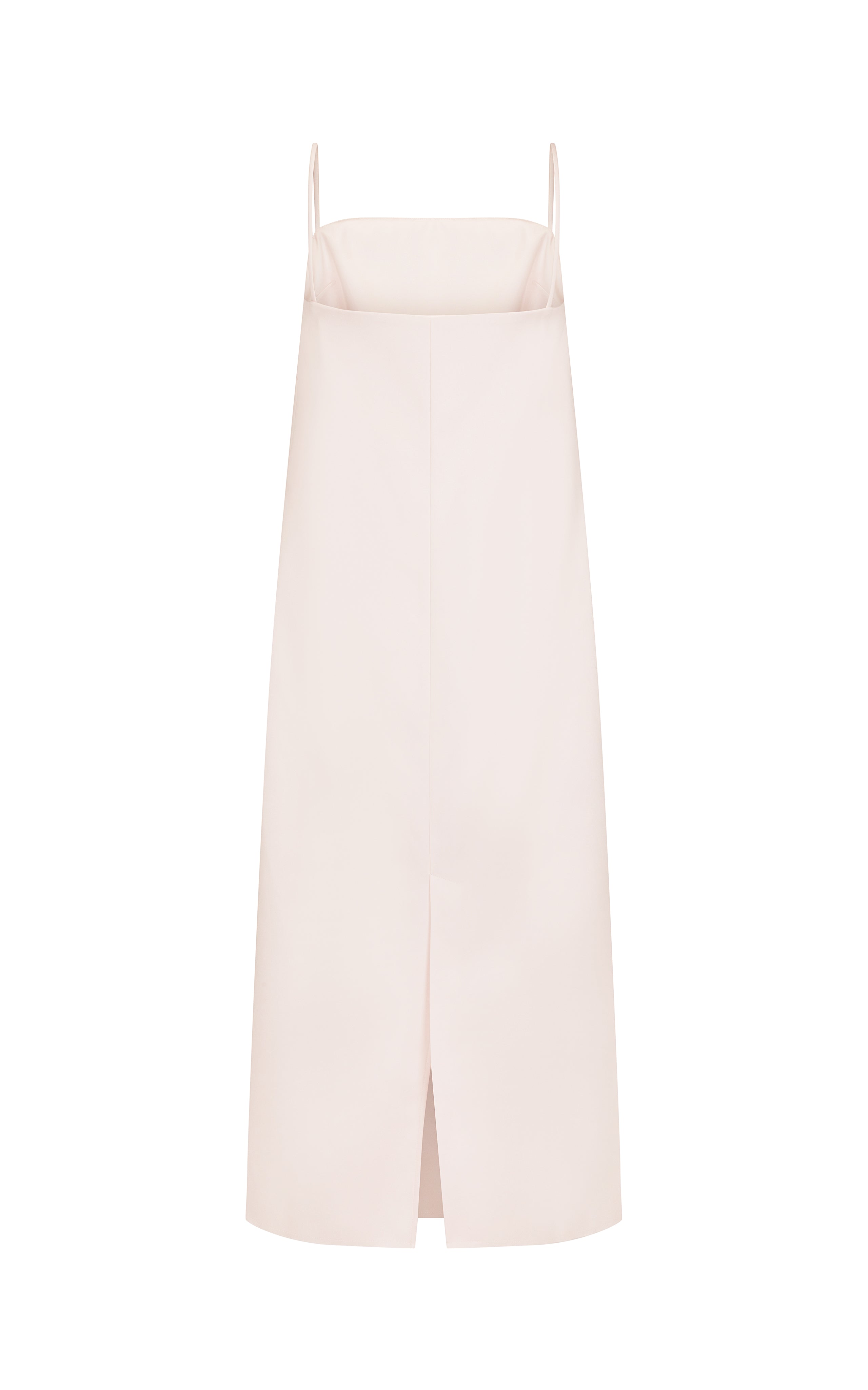 Cut in bonded satin, the Claudia Dress in Powder is an elegant and structured dress. Finishes mid calf with back tailored vent.