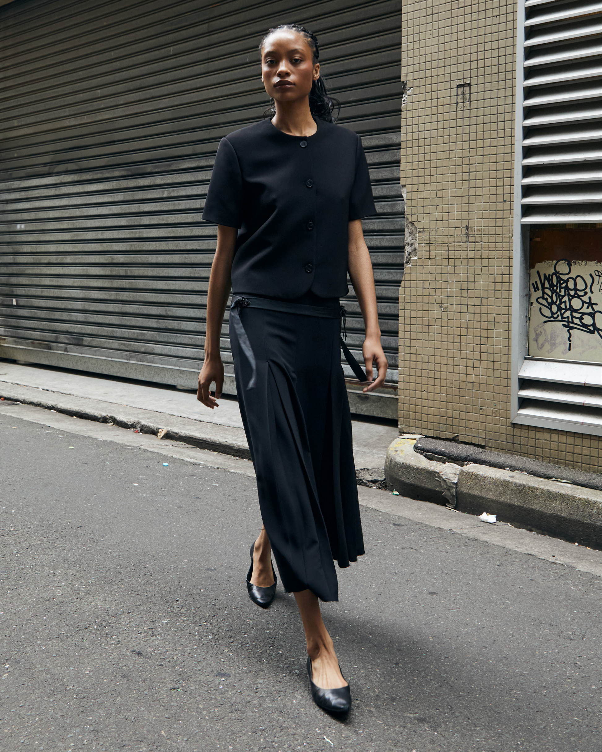 A collarless cropped jacket. Fully lined and designed with '50s and '60s tailoring references in mind. Cut in black bonded suiting.